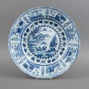 Delfts aardewerk schotel met blauw-wit decor in Wanli-stijl: eenden aan de waterkant, eind 17e/begin 18e eeuw -randchip en glazuurverlies langs randen-, Ø 32,5 cm