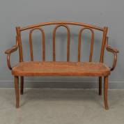 Gebogen beukenhouten kinderbankje met rotan zitting, uitvoering Thonet, gemerkt onder voorregel -armleuning gerestaureerd met metalen buisjes-, 67 × 93 × 40 cm