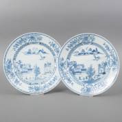 Twee Chinees porseleinen dubbelborden met blauw-wit decor van landschap en waterpartij met bootjes, Qianlong -randschilfers-, Ø 28,5 cm