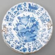 Chinees porseleinen dubbelbord met blauw-wit floraal decor, gemerkt met ruit met linten, Kangxi -chip-, met 2e gehalte zilveren hengsel met gravédecor, 1858, Ø 27,5 cm