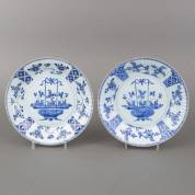 Twee Chinees porseleinen dubbelborden met blauw-wit decor van een bloemenmand en geribbelde rand, Kangxi, Ø 28,5 cm