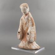 Polychroom beschilderd Chinees terracotta beeld: hofdame, Han-stijl en vermoedelijk periode -handen ontbreken, hoofd is los-, 54 × 27 × 19 cm, staand op plexiglazen basement, 35 × 25 cm