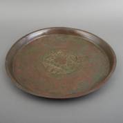Indonesische koperen Talam offerschaal met opstaande rand en centraal een reliëfdecor, Java, vermoedelijk 9e eeuw -restauratie en twee scheuren in de rand-, Ø 56 cm