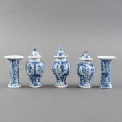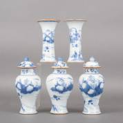 Vijfdelig Chinees porseleinen kaststel met blauw-wit decor van figuren in landschap, 18e eeuw -één dekselvaas met restauratie aan hals en deksel, één deksel met chip-, dekselvaas 17 × Ø 7,5 cm