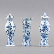 Driedelig Chinees porseleinen kaststelletje met blauw-wit floraal decor, 18e eeuw -defecten-, hoogte vaasje 11,5 cm