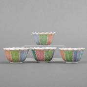 Vier gecontourneerde Chinees porseleinen famille rose kommetjes met aan de buitenzijde polychroom geschakeerd decor, aan de binnenzijde een engeltje, Yongzheng -één gelijmd-, 3,6 × Ø 6,4 cm