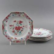 Zes Chinees porseleinen famille rose octagonale borden met pioenrozendecor, Yongzheng/Qianlong -haarlijnen, enkele randschilfers, bakfoutjes-, Ø 21,5 cm