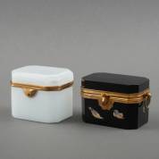 Zwart opaline glazen kistje met messing beslag en gehoogd decor van vogels en insecten -decoratie sleets-, en wit opaline glazen kistje met messing beslag -chips-, Italië, 19e/20e eeuw, zwarte kistje 8 × 11 × 7 cm