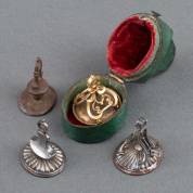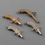 Vier metalen miniatuurpistooltjes, waarvan één percussie en drie penvuur, alle eind 19e eeuw, lengte grootste 4,8 cm