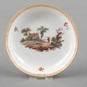 Amstel porseleinen schoteltje met polychroom decor van man met knapzak in landschap, gemerkt in onderglazuur blauw Amstel en ingekerfd L3 en N, Ø 13 cm