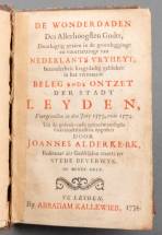 Boek: Leiden - Alderkerk, J. De wonderdaden des allerhoogsten Godts ... inzonderheit kragtdadig gebleken in het vermaarde beleg en ontzet der stadt Leyden in 1573 en 1574. Derde druk. Leyden, 1734. (48) 260 pp. Kl.8vo. Leder uit de tijd -bandje versleten, middelmatig exemplaar-