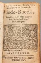Boek: 'Mopsje' - 't Groot Hoorns, Enkuyser, Alckmaerder en Purmerender Liede-Boeck, verciert met veel mooye bruylofts-liedekens en gesangen. Amsterdam, Gijsbert de Groot Keur, 1746. 310 (van 312), 8 pp. 16mo. Kalfslederen bandje uit de tijd, goudstempeling op platten en rug. De melodie werd aangegeven door verwijzing naar toenmaals algemeen bekende wijzen -defect aan rug, hoeken afgestompt, klamp ontbreekt, blad 223/224 ontbreekt-, 7,5 × 5,5 × 2 cm