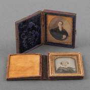 Kleine portretfoto van een vrouw, vermoedelijk een albuminedruk, eind 19e eeuw -foedraaltje defect-, en miniatuurportret van een man, vermoedelijk een gehoogde fotodruk, foedraaltjes 7,5 × 6 cm