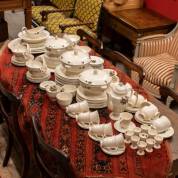 Creamware serviesgedeelte, model Edme, decor Moss Rose, uitvoering Wedgwood, bestaande uit: elf dinerborden Ø 26,5 cm, acht dessertborden Ø 23 cm, twaalf taartbordjes Ø 18 cm, elf broodbordjes Ø 16 cm, twaalf soepkommen met schotels, koffiepot, negen koffiekop-en-schotels, negen theekop-en-schotels, negen eierdopjes en divers dienservies