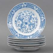 Serie van zes Chinees porseleinen borden met blauw-wit decor: centraal twee viertenige pareljagende draken, in de rand vissenparen tussen de golven, gemerkt met gaasvlieg, Kangxi -randschilfers, chips en haarlijnen-, Ø 21 cm