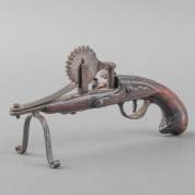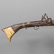 Lang vuursteenpistool met rijk bewerkte kolf, op de flank een ajourgezaagd applique met decor van figuren in krulmotieven, eind 17e/begin 18e eeuw -kolf op twee plekken gelijmd, slot blijft niet goed open staan-, lengte 53 cm