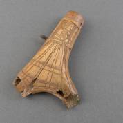 Driehoekige metalen musketiers kruithoorn met reliëfdecor van soldaat, vermoedelijk Duitsland, circa 1600 -stoffen delen in grote mate vergaan, doseerdop mist-, 28 × 22 × 6 cm