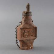 Gedreven koperen kruithoorn met decor van jager met hond, West-Europa, 19e eeuw, 18 cm hoog