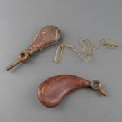 Twee kruithoorns, de een van gedreven koper, de ander leder, beide met Boché Patent laadsysteem, 19e eeuw, het lederen exemplaar is 24 cm lang