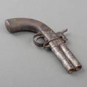 Percussiepistooltje met twee boven elkaar geplaatste lopen op ieder hun eigen trekker en hamer, midden 19e eeuw -mechanisme defect-, lengte 19 cm