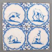 Vier aardewerk accoladetegels met blauw-wit decor van dieren, 17e eeuw -lichte randschades-, 13 × 13 cm