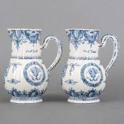 Paar Delfts aardewerk geribbelde oorkannen met blauw-wit decor: centraal een wapenschild met diagonale balk en drie ruiten aan weerszijden, daarnaast aan beide kanten een vaasornament, omringd door een bloemenkrans, onderop gemerkt met VII in reliëf, 18e eeuw, 20,5 × 16 × 12 cm