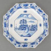 Octagonaal Delfts bordje met gecontourneerde rand en blauw-wit decor van vruchten plukkende vrouw, aan achterzijde gemerkt met een P voor Jan Pennis, eigenaar De Porceleyne Schotel, midden 18e eeuw -enkele randschilfers-, 18,5 × 18,5 cm
