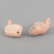 Twee aardewerk olielampen: één olielamp met figuur, Romeins, 10 × 7cm, en één olielamp met kruis, vermoedelijk Egypte, Byzantijnse periode -oor gelijmd- ,13 × 6 cm, herkomst: privécollectie oud-directeur Museum Kam, Nijmegen