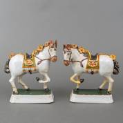 Paar polychroom Delfts aardewerk paarden, 18e eeuw -defecten, gelijmd, gerestaureerd-, 23 × 22 cm