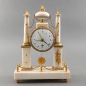 Marmeren porticopendule met verguld bronzen ornamenten, adres: Bourgeois Picart, Frankrijk, Louis Seize -een ornament en paar kettinkjes zitten los, maar zijn wel aanwezig-, 30 × 22 × 10 cm, inclusief slinger en opwindsleutel
