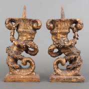 Paar verguld houten meubeldelen in de vorm van een cornucopia met bloemslinger, Italië, 17e eeuw -oude houtwormgaatjes-, 34 × 17 × 8 cm
