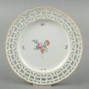 Amstel porseleinen bord met opengewerkte rand, verguldsel en strooibloemdecor, gemerkt Amstel en M:OL in onderglazuur blauw, eind 18e eeuw, Ø 26,5 cm