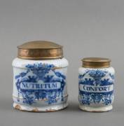 Twee Delfts aardewerk apothekerspotten met messing deksel, met blauw decor en opschrift: 'Nutrium' en de kleinere 'P Confort', beide gemerkt AP voor Anthonij Pennis, De Twee Scheepjes, derde kwart 18e eeuw -beide met defecten-, grootste 12 × Ø 11 cm