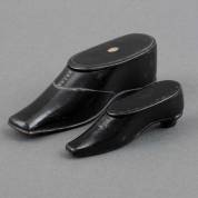 Twee zwartgelakte papier-maché snuifdozen in vorm van schoenen, beide met schuin openend deksel, de grote met parelmoer inleg, 19e eeuw, grote schoen 12,5 cm