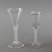 Twee diverse slingerglazen met dubbele slinger in de stam, 18e eeuw -beschadigingen-, grootste 18,5 cm