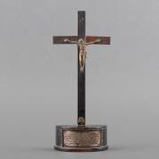 Houten crucifix met messing Corpus Christi, de voet met plaquette waarop inscriptie: 'Kruisbeeld van onzen zaligmaker Jezus Christus Opgedolven op den 20 Maart 1820 op de Buitenplaats Oud Poelgeest (Voormalige Abdij) bij Leijden Door Jan Hagel Smit wonende te Leijden', Corpus mogelijk 15e/16e eeuw -kruis provisorisch gelijmd, oude houtwormgaatjes en ontbrekend ornament-, 29 × 11 × 5,5 cm