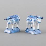 Paar Delfts aardewerk koeienbeeldjes met blauw-wit decor, gemerkt De Griekse A, genummerd 5, 18e/19e eeuw -chips-, 8 × 10 × 5 cm