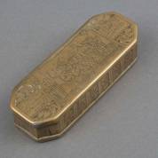 Messing tabaksdoos met gegraveerd decor: een engel houdt Bileam en de sprekende ezelin tegen, met inscriptie: 'Wie staat niet als verbaast, verwonder in den geest, als hij van bieliam en van sijn eesel leest', en onderop nog een voorstelling en inscriptie: 'Hem die een aards besit zoorgvuldig hat geëert, en hij heeft goedt dec nekt(?) hartnekkieg toeg[e]ke[e]rt', 18e eeuw, 3,5 × 15,5 × 6 cm