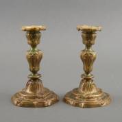 Paar messing kandelaars met rocailles, Frankrijk, Louis Quinze -patina vlekkerig door wasdruppels, vroeger verguld geweest-, 19 × Ø 12 cm