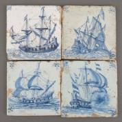 Vier diverse Delfts blauwe tegels met schependecors: oorlogsschip vuurt kanon af, Engels schip vergaat, en twee spiegelretourschepen, alle midden 17e eeuw -alle met missend glazuur en randschilfers-