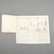 Spotprent: 'Den door list en geweld aangevallen Leeuw'. Plano, met gegraveerde spotprent (19 × 38 cm) op de politieke gebeurstenissen in 1780 en verklarende tekst in boekdruk (33 × 38 cm) 200-gevouwen- Gevolgd door een contemporain handschrift: 'Vrije gedachten van een Nederlandschen patriot over de onlangs uitgekoomene en veel geruchtmaakende kunstplaat ... benevens eenige staatkundige reflectien'. 16 pp. 4to. Omslag uit de tijd