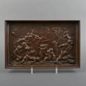 Bronzen vide-poche met reliëfdecor van spelende cherubijnen, gesigneerd La Rue, 4,5 × 31,5 × 24 cm