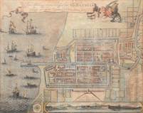 Handgekleurde gravure: 'Waere affbeeldinge wegens het casteel ende stadt Batavia gelegen opt eylant Java anno 1681', uitgave uit 1681 naar de kaart uit 1650 door Clement de Jonghe (1624-1677) -wat vlekkerige verbruining van het papier-, 41 × 51 cm
