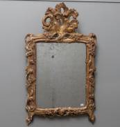 Spiegel in gesneden en vergulde houten lijst, bekroond door kuif, Louis Quinze -vergulding sleets, kuif met oude houtwormgaatjes en ooit afgebroken geweest-, 75 × 46 cm