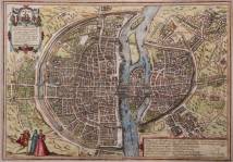 Handgekleurde gravure, kaart van Parijs: 'Lutetia, vulgari nomine Paris, urbs Galliae maxima...', uitgegeven door Georg Braun & Frans Hogenberg, circa 1580, 34 × 48,5 cm