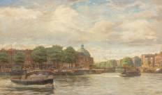 Hollandse School: Amsterdams stadsgezicht met de koepelkerk, olieverf op doek, r.o. gesigneerd en gedateerd '56 -spieraam zichtbaar-, 120 × 200 cm