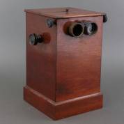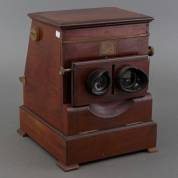 Tafelstereoscoop met plek voor 25 foto's, model Le Taxiphote, eerste kwart 20e eeuw -mechanisme lijkt niet te werken, meerdere barsten in mahonie kast-, 52 × 38,5 × 38,5 cm