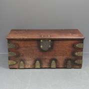 Grote hardhouten compagniekist met messing beslag, op de zijkant met vervaagd pseudo brandmerk: VOC 17?? -slot vervangen, binnenbakje ontbreekt-, 63 × 65 × 147 cm