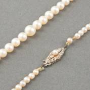 En-chûte geknoopt parelcollier van vermoedelijk deels natuurlijke parels, aan 2e gehalte zilveren tonsluiting gezet met simuli, brutogewicht 14,4 gram, circa 78 cm