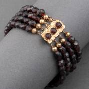 Vierstrengs granaten armband van gefacetteerde kralen aan bakslot gezet met drie granaatjes en veiligheidsketting, 18,5 cm
